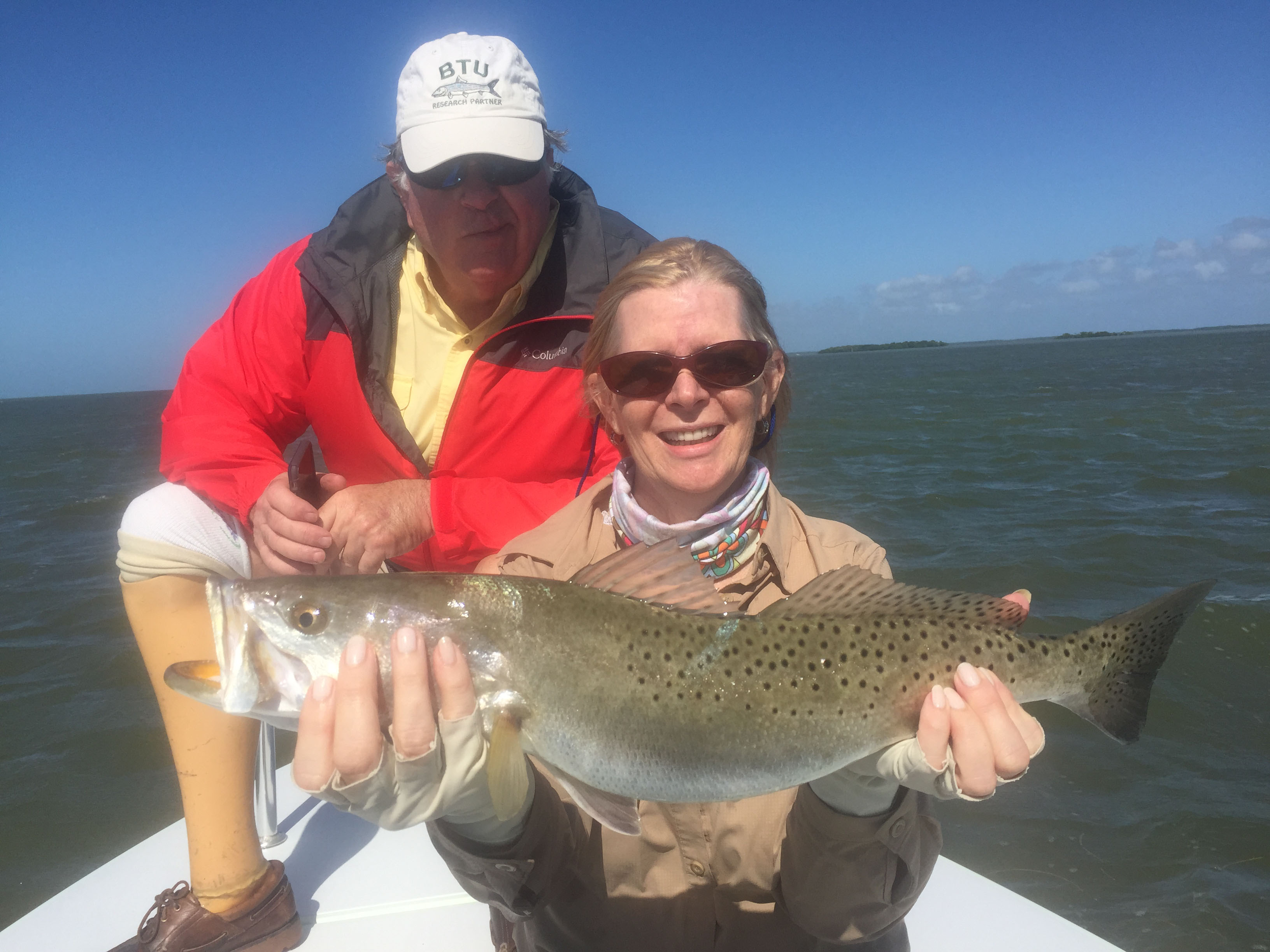 Home → Florida Keys inshore flats backcountry sport fishing guide → Female, Seatrout → Red jack, female holding big trout